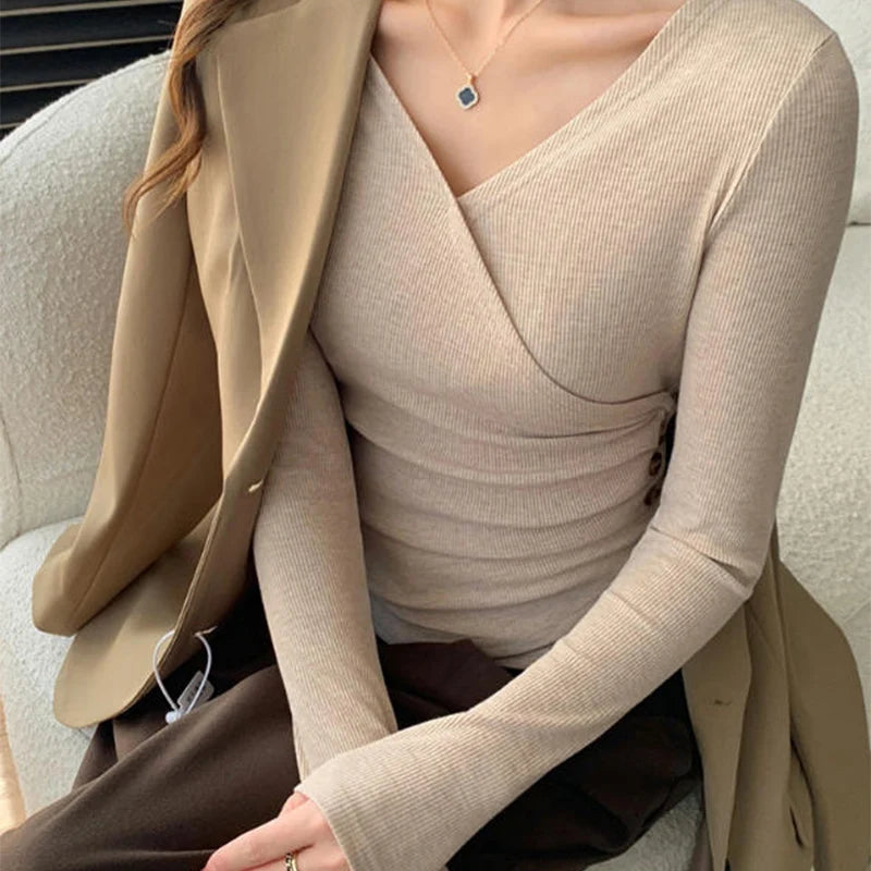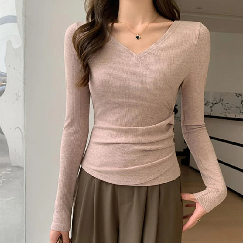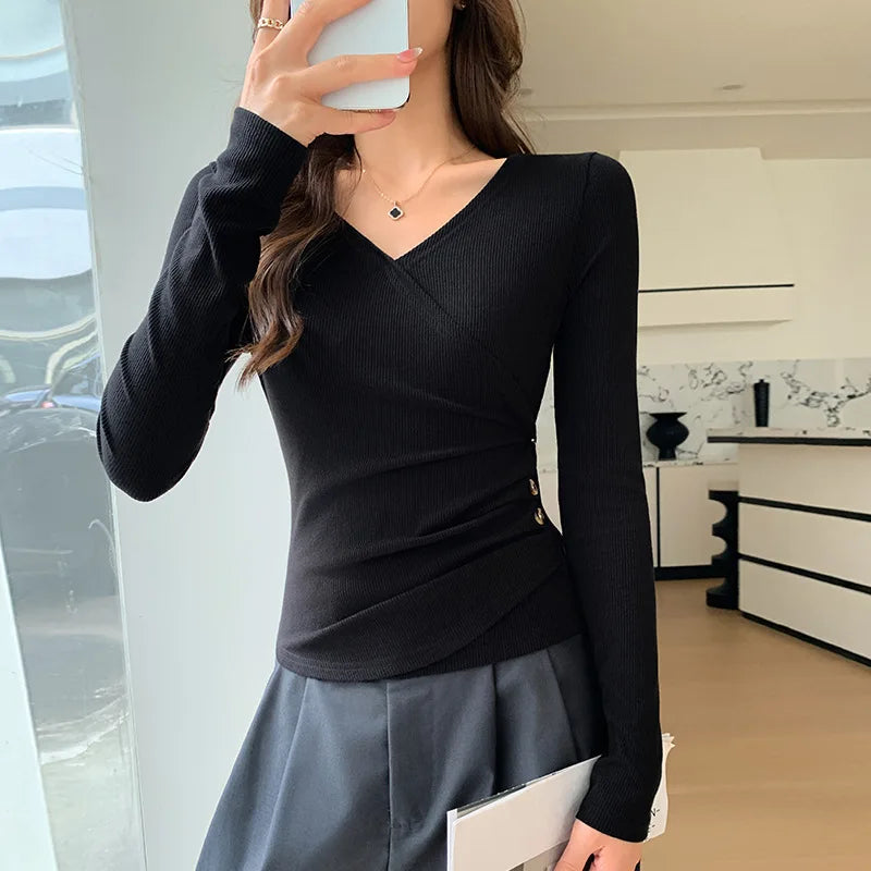 Cross V-Neck Ribbed Pullover T-Shirt Women Button Waist Cinched Long Sleeve T-Shirts Autumn Winter Elegant Office Lady Base Tees