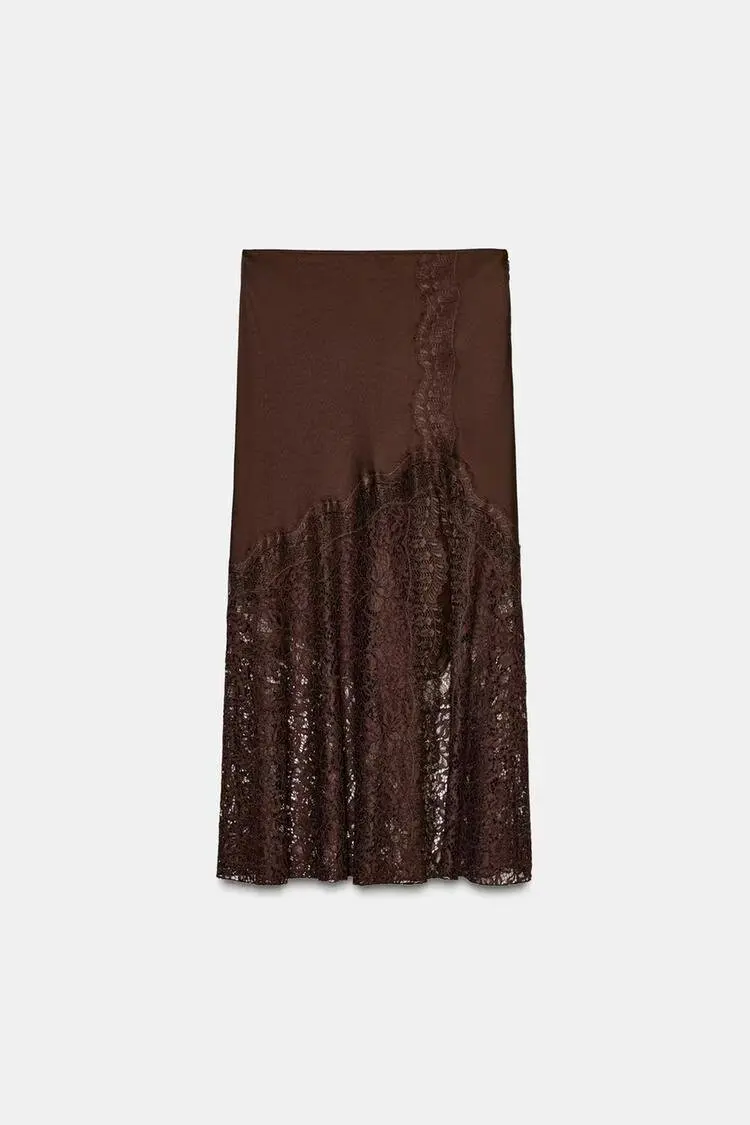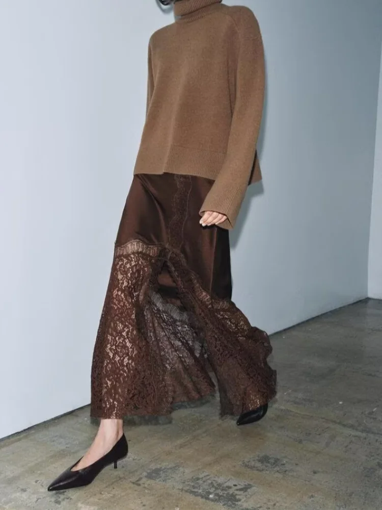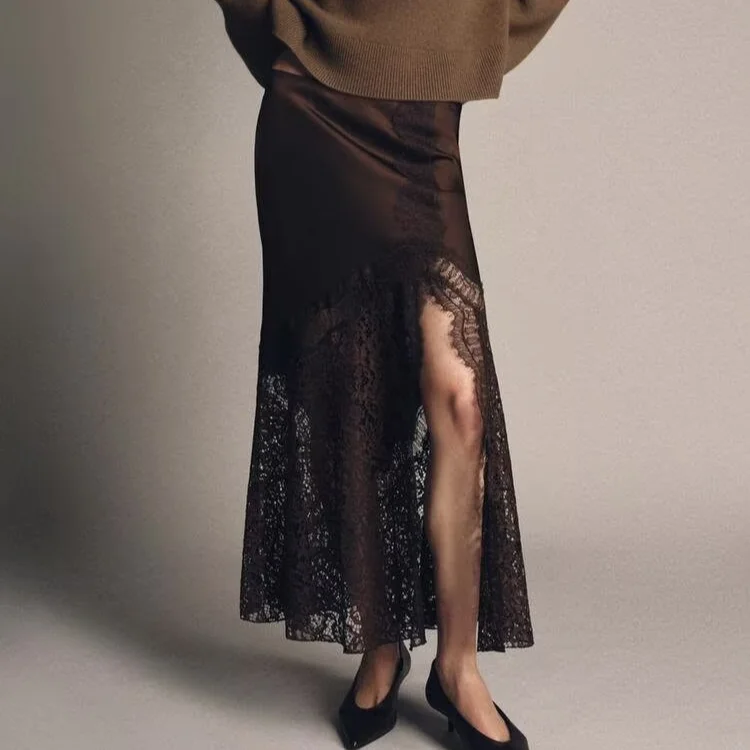 Sexy Lace Patchwork Long Skirt Women Elegant Fashion Solid Waist Cinched Mid-length Bottom Lady 2025 Party Daily Street Skirts
