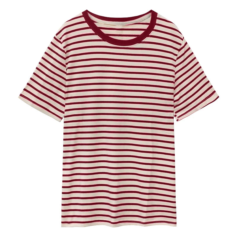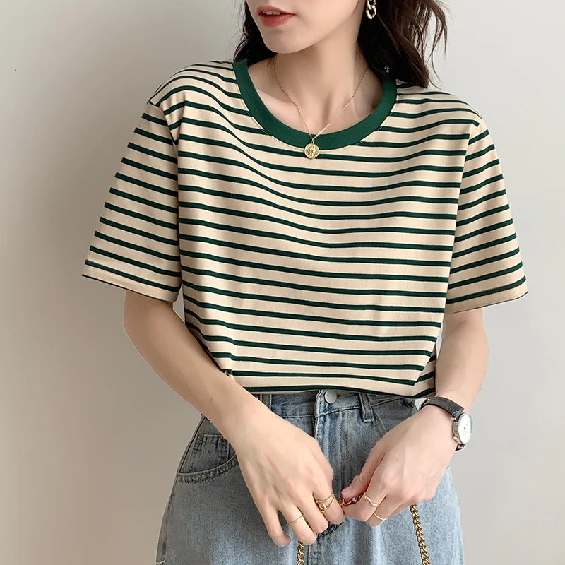 Summer Classic Striped Women's T-shirts 2025 New Short Sleeve O-neck Korean Casual Loose Shirts Knitwear Tops Female
